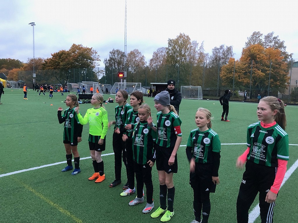 Återigen pratar vi om vikten av ett kort och tight lag och våga spela ut och nu är maskinen verkligen igång. Tjejerna verkar lite sura på att dom inte presterat matchen innan och dom bjuder på strålande fotboll i 2x15 minuter. Målen regnar men det tränarna är nöjda med är hur moget vi vårdar bollen och hur många korrekta beslut alla spelare tar. Tror det slutar 7-1 efter ett straffmål, två mål direkt på hörna, Alma med magen (?!) och Linnea med båda knäna (!?). Vi ser igen vikten av att våga spela med målvakten högt när Vårbys fiskare fångas upp Leona. Vid minst två tillfällen blir tänkbara frilägen till ingeting tack vare detta.